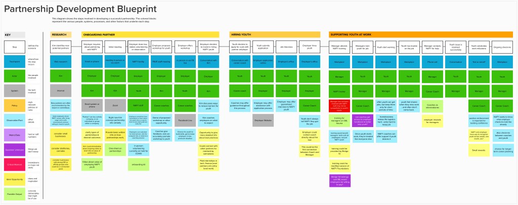 We used affinity mapping, journey mapping, and a service design blueprint to clarify the current process and identify concrete steps the agency could use to strengthen relationships with their employer partners.